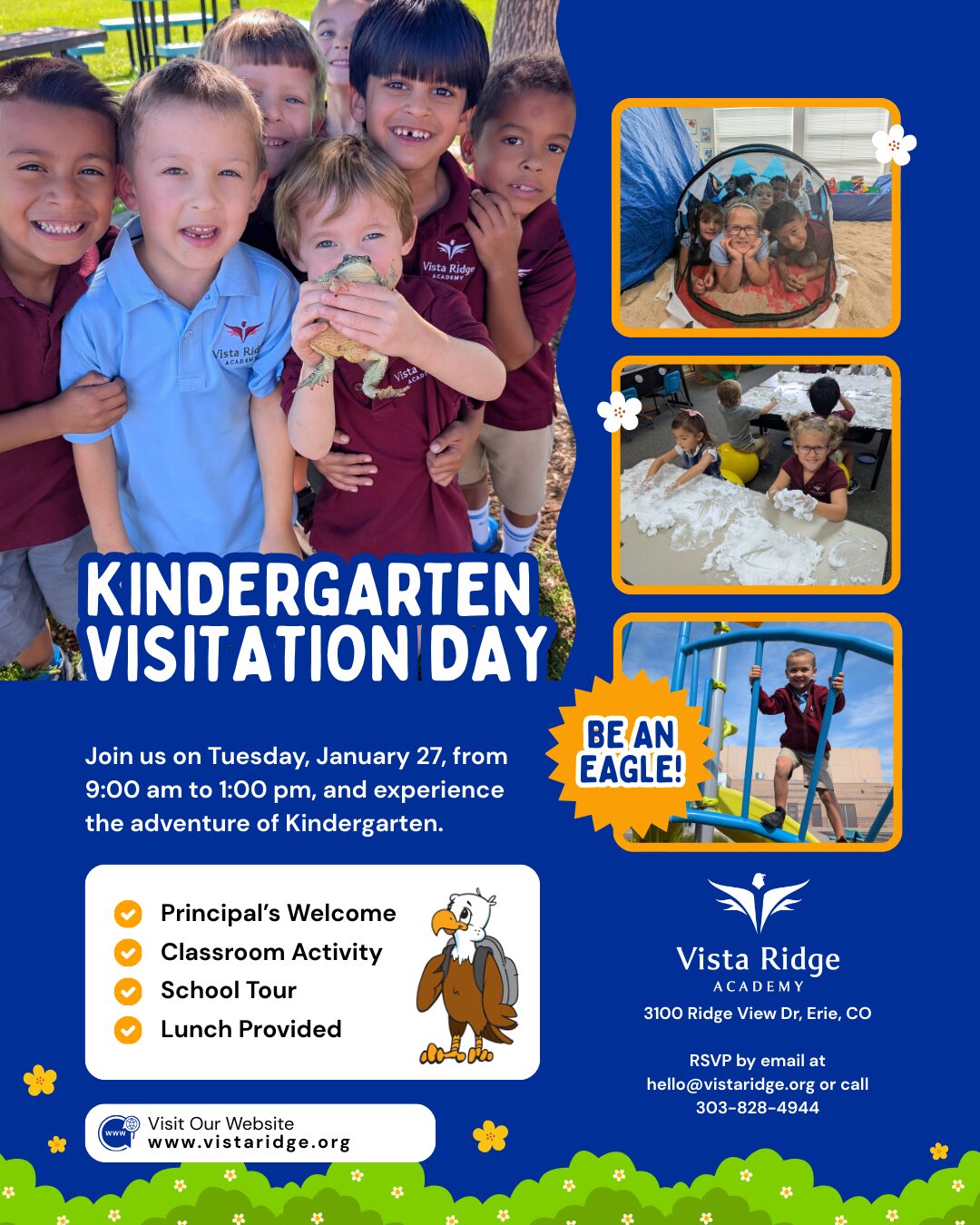 Be an eagle! Join us to experience the adventure of kindergarten with the principal’s welcome, classroom activities, and a school tour. Lunch will be provided.
